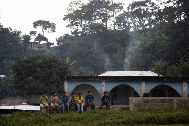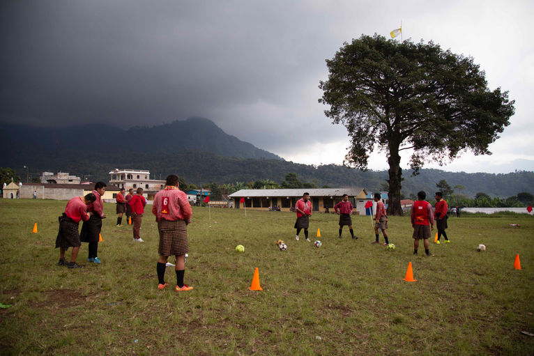 A group of men prepare themselves for a quick game of football. While this is a normal occurrence in the small town of Xejuyup in Nahualá, these men bring their traditional maya K'iche' culture to it. They decided their team's uniform would include a colorful shirt and a "coxtar", a sort of skirt which is part of the traditional men's clothing of their department, Sololá.